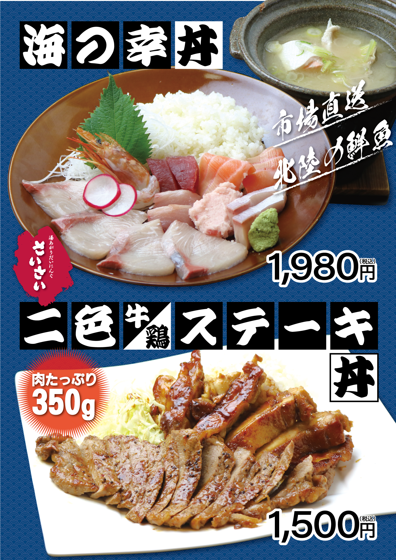 本日よりスタートの「海の幸丼」「二色ステーキ丼」です。